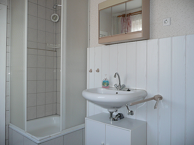 Badezimmer: Dusche, WC, zwei Waschbecken