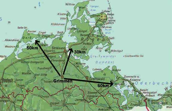 Grimmen liegt zentral in Mecklenburg-Vorpommern. Von Grimmen aus erreicht man die Urlaubshochburgen Fischland Darß, die Insel Rügen, die Insel Usedom und die Mecklenburger Schweiz in einer Autofahrstunde. Nach den Tagesausflügen in den belebten Urlausregionen kann man die Ruhe in Grimmen genießen.